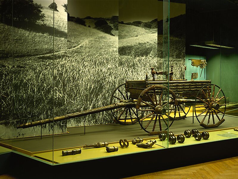 Museets udstilling består af jernalderbygningerne, hvor personer iført dragter fra perioden udfører daglidags aktiviteter som madlavning, herunder mjødbrygning, markarbejde og håndværk. De bruger levende historie som en del af formidlingsformen. Der er flere husdyr af racer, som også fandtes i jernalderen og en offerlund i et skovstykke. Skoven har man forsøgt at etablere med planter og træer, som fandtes i Denmark under jernalderen, heriblandt eg, bøg, ask, el og birk.