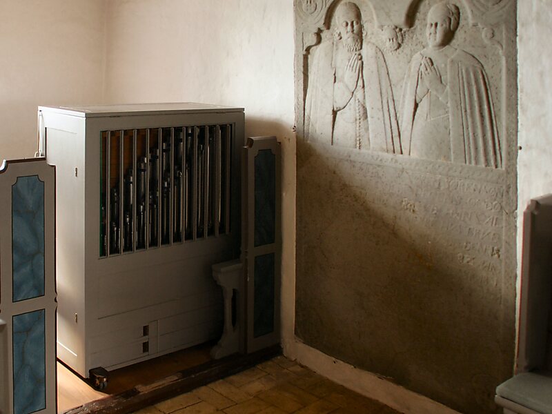 Den romanske døbefont af granit har to hoveder i højt relief. Altertavle er malet af Johan Thomas Skovgaard i 1928.