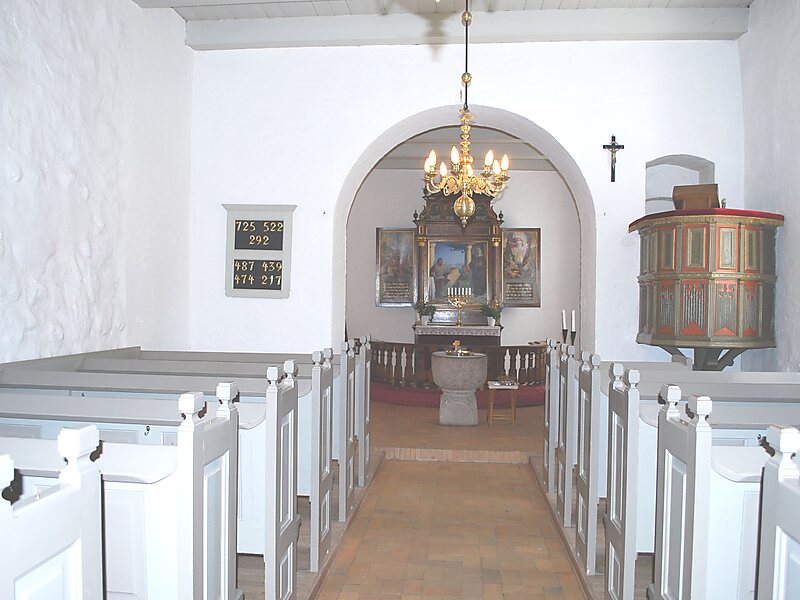 Kirkens kor og kirkeskib er opført af marksten på en syld af store kampesten. Dørfløjen er en fladbuet teglmuret døråbning fra kirkens oprindelsestid. Døren fra omkring 1550 består af tre egeplanker, som er beslået på ydersiden med jernbånd.