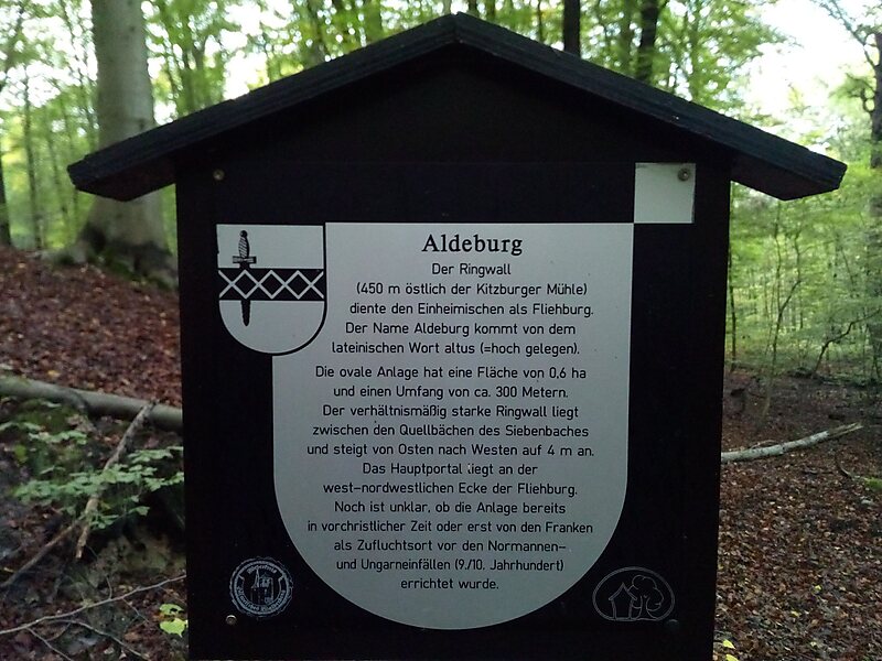 Der Burgstall der Aldeburg, versteckt in einem Buchenwald, zeigt im Norden einen 4 Meter hohen starken Wall mit vorgelegenem Graben, der in einem sumpfigen Wasserloch endet, sowie einen weiteren Vorwall mit Graben.