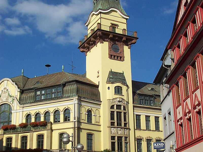 Das Rathaus wurde 1875 nach zwei Jahren Bauzeit fertiggestellt. Als Architekten fungierten Richard Schmidt und Melchior Schneider. 1905 bis 1907 wurde ein Umbau unter Gemeindebaumeister Hermann Eichner durchgeführt. Hierbei wurde der charakteristische Turm errichtet. Im November 1970 wurde das neue Rathaus am Rathausplatz bezogen. Im Jahr 1972 wurde das alte Rathaus unter Denkmalschutz gestellt und 1974 bis 1976 restauriert. Seit jener Zeit finden sich die Volkshochschule, die Stadtbücherei und Kulturräume im alten Rathaus.