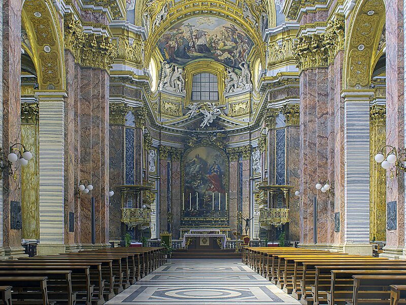 Die Kirche stellt mit ihrer Größe, ihrem lichtdurchfluteten Inneren, dem polychromen Marmor, vergoldetem Stuck und den zahlreichen allegorischen Fresken eines der herausragenden barocken Bauwerke Roms dar und erstrahlt, nachdem aufwendige Restaurierungsarbeiten vor einigen Jahren abgeschlossen wurden, in neuem Glanz.