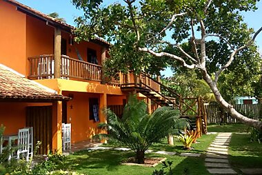This beachfront hotel in Morro de São Paulo, Bahia is surrounded by a tropical garden with palm trees.