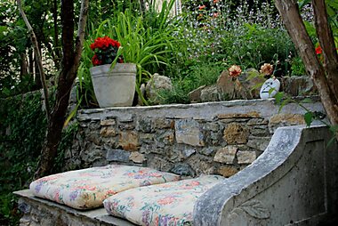 Stone-built Adis Oneirou is surrounded by a blooming garden in the village of Mouresi on Mount Pelion.