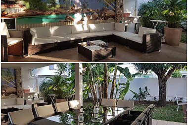 Villa les trois bleus features an outdoor swimming pool, bar, a shared lounge and garden in Saint-Gilles-les-Bains.