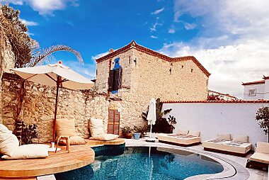 Combining whitewashed walls with pastel-coloured frames, this small design hotel in Alacati features a courtyard with a corner hot tub.