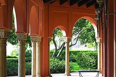 Arched doorways and marble hallways define the interior of this luxurious Riyadh hotel, next to King Abdulaziz Convention Center.