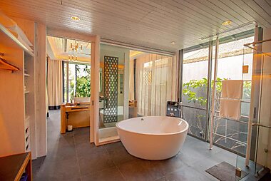 The 4-star luxury hotel is nestled within a rainforest, steps from the tranquil shores of Yao Yai Islands.