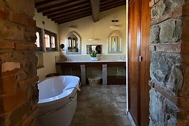 The Badia di Pomaio is a restored 17th-century abbey with a hillside location, 5 km from Arezzo.