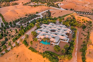 Panoramic views of the Rub al Khali Desert can be admired from this 5-star resort’s infinity pool and sun-lounger terrace.