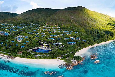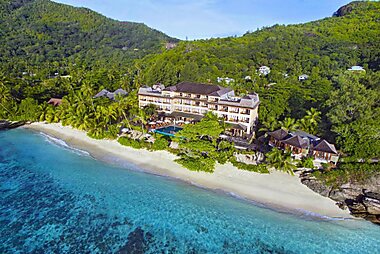 This luxurious resort on Mahe features air-conditioned villas overlooking the Indian Ocean.