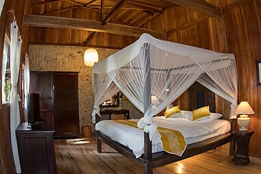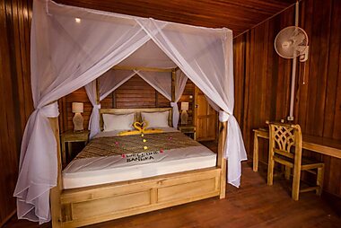 Blending nicely with the countryside, Raja Laut Dive Resort offers bungalows built with wood from coconut palms.