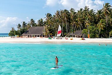 Nestled within tropical greenery, Biyadhoo Island Resort offers charming beachfront accommodation and a variety of water sports.