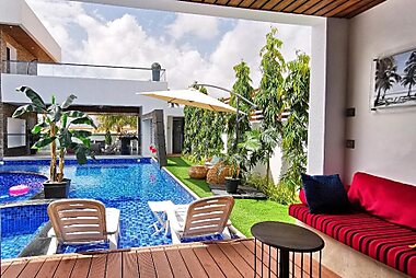 Guests may go for a swim in the private pool. The villa also offers an indoor pool and a garden for guests to relax in.