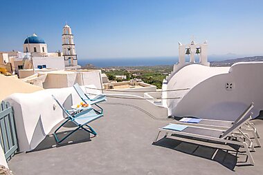 Located at the top of the medieval castle of Pyrgos and overlooking Santorini Island, this villa features a sun terrace with scenic sunset…