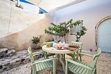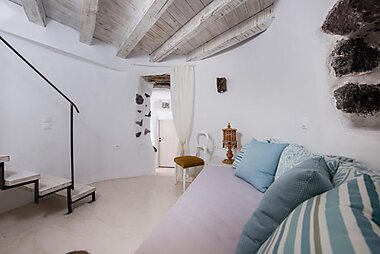 The restored Anemoscope Windmill Villa is situated in the traditional village of Pyrgos. It boasts an outdoor hot tub and BBQ facilities.
