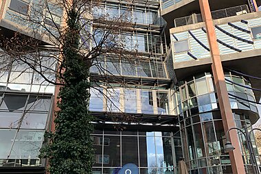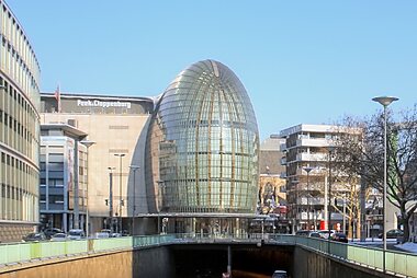 This building with a glass facade houses a shopping passage, an archive and a library. It used to be a broadcasting company's seat.