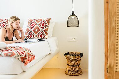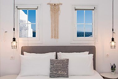 Set on an elevated position, the Cycladic-style Germanos Studios offers rooms and studios with panoramic views over the Aegean Sea.