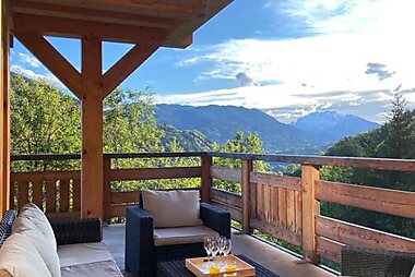 Featuring a panoramic view of Grand Bornand village, Chalet Socali Le Grand Bornand offers access to a garden and terrace a garden.