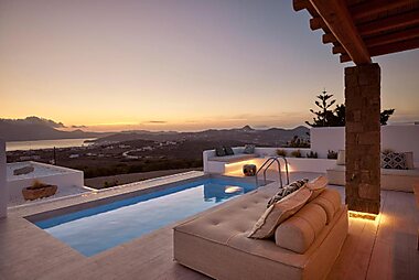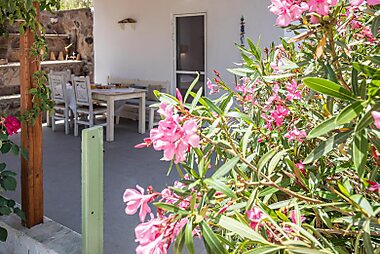 Quietly set 656 feet from Adamas Port in Milos, this Cycladic-style house features a blossomed garden.