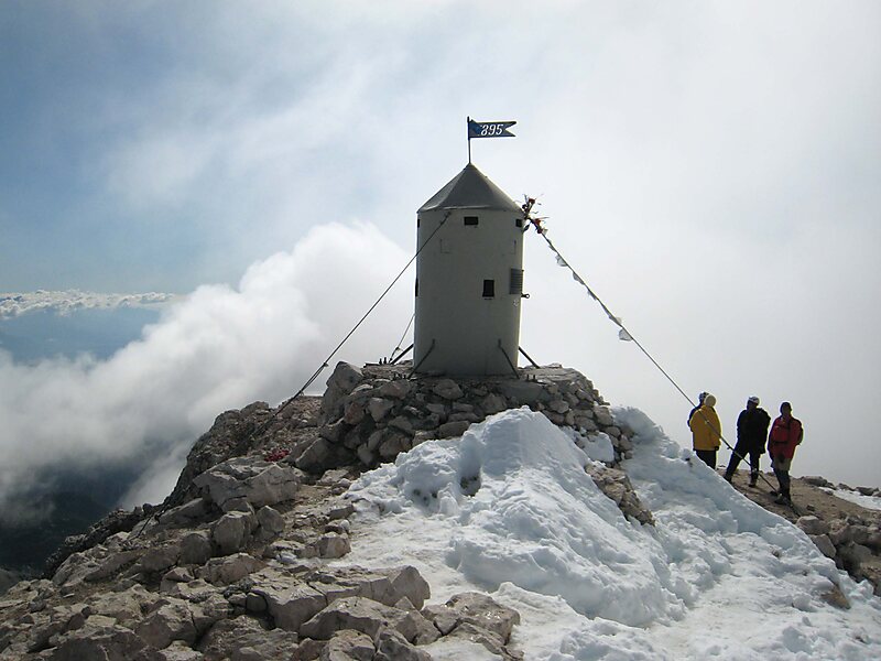 Aljaž Tower or the Triglav Tower is a tower, a storm shelter and a triangulation point on the summit of Mount Triglav in northwestern Slovenia. Along with Triglav, it is a landmark of Slovenia and a symbol of the Slovenehood. The tower was designed by Jakob Aljaž, a priest in the Upper Carniolan village of Dovje, who also had it erected, in 1895. Today it is owned by the state, tended by the Ljubljana Matica Alpine Club and stands on a parcel belonging to the Municipality of Bohinj.