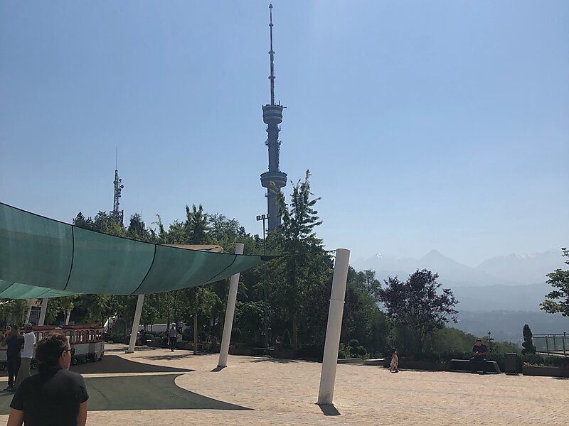 The Almaty Television Tower, or simply Almaty Tower, formally the Koktobe TV Tower is a 371.5-metre-high steel television tower built between 1975 and 1983 in Almaty, Kazakhstan. The tower is located on high slopes of Kok Tobe mountain south-east of downtown Almaty. Unlike other similar TV towers, it is not a concrete, but a steel tubular structure. It is the tallest free-standing tubular steel structure in the world.The tower is 371.5 m tall; its 114 m metal aerial reaches 1000 meters above sea level. It has two observation decks at the height of 146 m and 252 m, which are accessible by two high-speed elevators. It is however not open to the public.