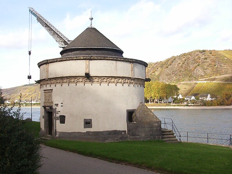 A few hundred metres downstream of Andernach the Rhine valley narrows from both sides forming the northern part of the romantic Middle Rhine stretch. Already in Roman times the place the narrow passage begins was named "Porta Antunnacensis" or Andernachian Gate. It is formed by two hills, the Krahnenberg and the Engwetter on the right bank near the wine village Leutesdorf. The crane hill is named after the old crane beneath his foot; in earlier times the hill was named "Geiersberg".