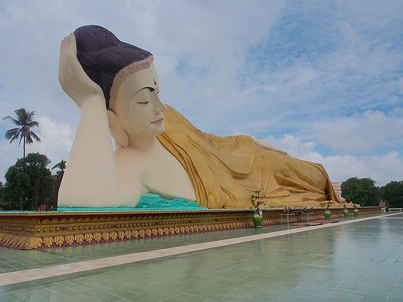 The Shwethalyaung Buddha is a reclining Buddha statue. The Buddha, which is the second largest in the world at a length of 55 metres and a height of 16 metres, is believed to have been built in 994. It was lost in 1757 when Pegu was pillaged. During British colonial rule, in 1880, the Shwethalyaung Buddha was rediscovered under a cover of jungle growth. Restoration began in 1881, and Buddha's glass mosaic pillows were added in 1930.