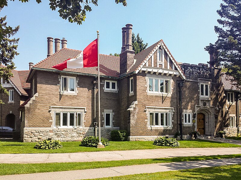 Many luxury homes and several embassies line the street. The north end connects to the Kichi Zibi Mikan and the Champlain Bridge, which crosses the Ottawa River into Gatineau, Quebec. Island Park Drive is named for Bate Island, the largest island crossed by the Champlain Bridge, which has a small park with road access. The south end connects to the Central Experimental Farm, where it becomes the NCC Driveway.
