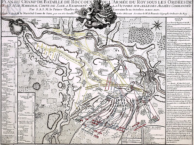 The Battle of Rocoux took place on 11 October 1746 during the War of the Austrian Succession, at Rocourt, near Liège in the Prince-Bishopric of Liège, now modern Belgium. It was fought between a French army under Marshal Saxe and a combined British, Dutch, German and Austrian force led by Charles of Lorraine, John Ligonier and Prince Waldeck.