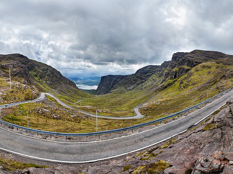 The historic mountain pass was built in 1822 and is engineered similarly to roads through the great mountain passes in the Alps, with very tight hairpin bends that switch back and forth up the hillside and gradients that approach 20%. It has the greatest ascent of any road climb in the United Kingdom, rising from sea level at Applecross to 626 m in about 6 km, and is the third highest road in Scotland.