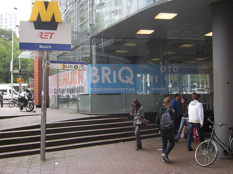 Beurs is a major subway interchange station in the center of Rotterdam. Underneath Churchill Square, the two lines through the city center intersect. Passengers for Rotterdam Central Station change here to line D or E if they started their journey on line A, B, or C.