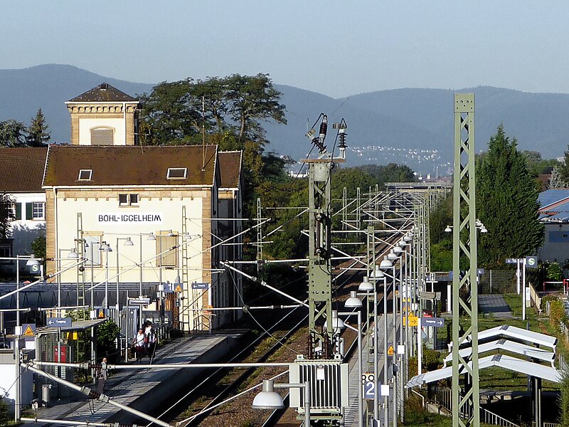Böhl-Iggelheim station is in the town of Böhl-Iggelheim in the German state of Rhineland-Palatinate. Deutsche Bahn classifies it as a category 5 station and it has two platforms. The station is located in the network of the Verkehrsverbund Rhein-Neckar. Its address is Am Bahnhofsplatz 4.It is located on the Mannheim–Saarbrücken railway, which essentially consists of the Palatine Ludwig Railway. It was opened on 11 June 1847, when the Ludwigshafen–Neustadt section of the Ludwig Railway was put into full operation. Until the Second World War, the station was significant as a regional freight hub, but since about 1970 it has served almost entirely as a passenger station. In the meantime, it has been reconstructed as a halt. Since December 2003, it has been served by lines S1 and S2 of the Rhine-Neckar S-Bahn. Its former entrance building is heritage listed.