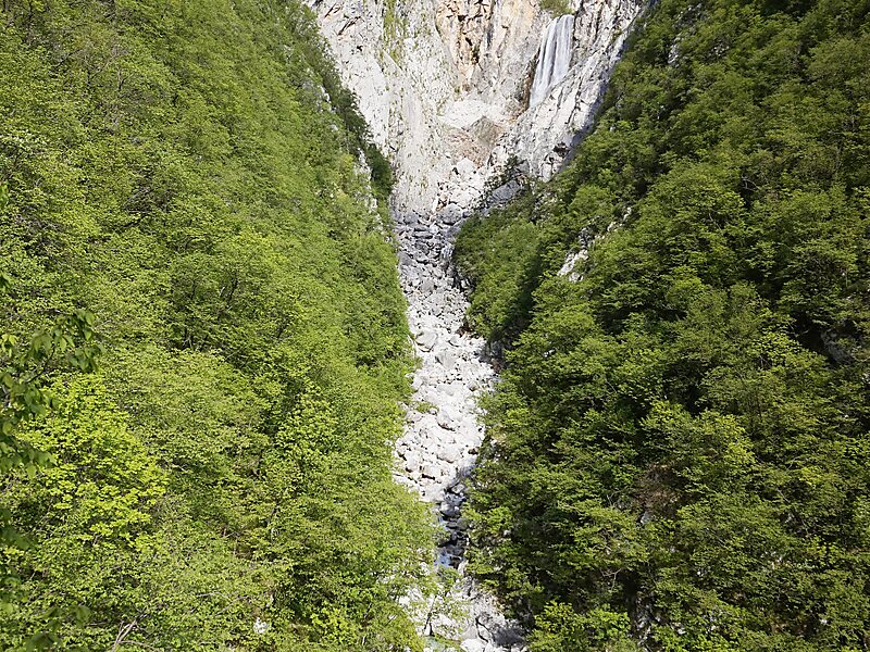 Boka is a waterfall in the western part of Slovenia, near the Soča River. It begins at a karst spring and has two stages, of which the first is 106 meters high and 18 meters wide, and the second is 33 meters high.
