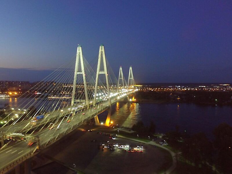 The Great Obukhovo Bridge is the newest bridge across the Neva River in Saint Petersburg, Russia. It is the only bridge across the Neva which is not a drawbridge. One of the longest bridges in Russia, it is the first fixed bridge and largest bridge across the Neva. Of course it is the largest bridge in St. Petersburg by the size of the covered span. It is located in Nevsky District, in the middle stream of the Neva. It connects Obukhovskaya Oborony Avenue with the Oktyabrskaya embankment. It is a cable-stayed bridge; the steel wire ropes are the key element of the supporting construction. But what looks like a bridge is actually two identical twin bridges with opposite directions of movement along them. One is located upstream of the Neva and is for driving eastward, the other downstream is for driving in a western direction.