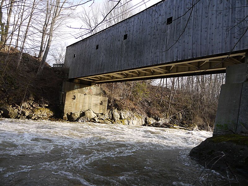 Bull's Bridge is a single-lane vehicular wooden covered bridge across the Housatonic River in the town of Kent, Connecticut, close to the state border with New York. The first instance of a bridge at this location was constructed by Jacob and Isaac Bull in 1760, which gave the bridge its name. Popular legend suggests that George Washington crossed the bridge with the Bulls' assistance while still under construction. The current bridge was built in 1842 from timber, with additional supports added in the 19th and 20th centuries. Built with a Town lattice design, the bridge has reinforced trusswork visible on the interior. At the time of its nomination to the National Register of Historic Places the roof had wood shingles. It is historically significant as one of three surviving covered bridges in Connecticut, and was listed on the National Register of Historic Places in 1972.