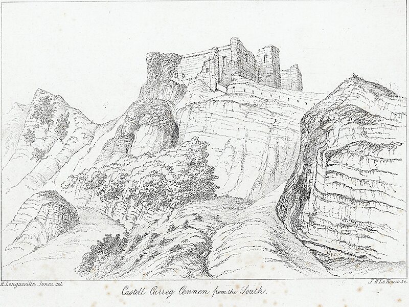 The dramatic limestone precipice was originally the site of a native Welsh castle, possibly constructed by The Lord Rhys, although any remains of this castle have been subsumed by later English work. In 1277, during the conquest of Wales by Edward I, the English gained control of the castle. It was briefly retaken by Welsh forces in 1282, but was back under English control by the following year, when it was granted to the English baron John Giffard. The castle was unsuccessfully besieged by Owain Glyndŵr during the Welsh Revolt. During the Wars of the Roses it was surrendered to the Yorkists and slighted in 1462 to prevent further use.