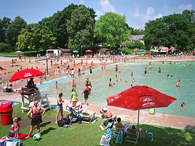 Centennial Beach is a public aquatic park located at 500 W. Jackson Avenue in Naperville, Illinois. The Beach is within an abandoned, double quarry alongside the DuPage River. The facility covers almost 6 acres of land with a full two acres or 6.2 million gallons of open water from Lake Michigan, all tested, re-circulated and chlorinated on site.