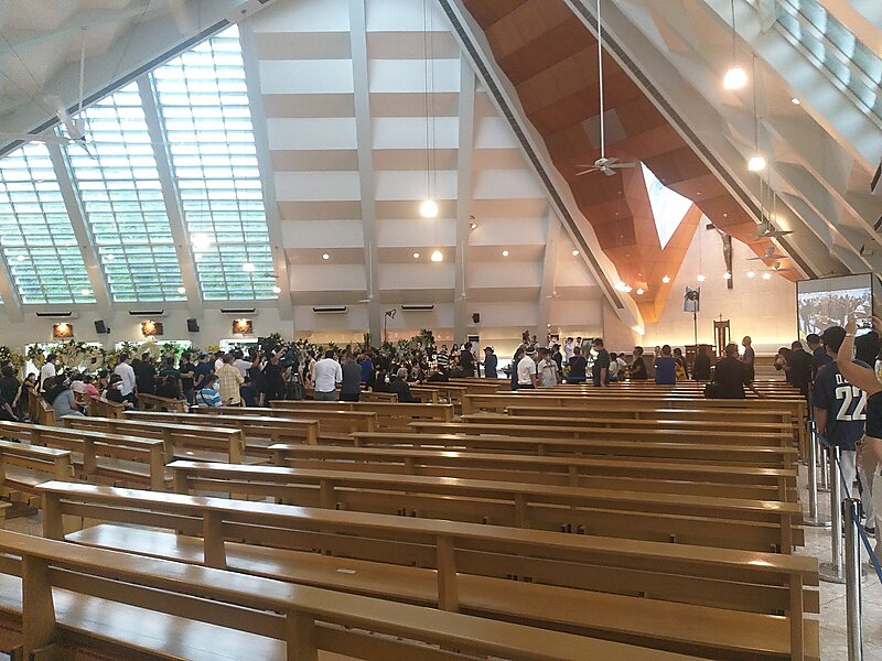The Church of the Gesù is the Roman Catholic church of the Ateneo de Manila University campus in Quezon City in the Philippines. It is under the jurisdiction of the Diocese of Cubao. The church was designed by Jose Pedro Recio and Carmelo Casas. The edifice’s massive triangular structure symbolizes the Holy Trinity, as well as the three-fold mission and vision of the school. Its shape and design are also meant to suggest the outstretched arms of the Sacred Heart, and the traditional Filipino bahay kubo. The site has a total area of 10,200 square metres and seating capacity for 1,000 persons. The church is situated on Sacred Heart Hill, a small hill overlooking Bellarmine Field, believed to be the highest point in barangay Loyola Heights. In its immediate vicinity are the dormitories and the John Pollock Renewal Center. The peak cross and carillon of the church can be seen from Katipunan Avenue, which borders the campus to the west.