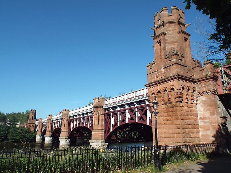 The City of Glasgow Union Railway built the first railway bridge over the River Clyde in the City of Glasgow here, which opened in 1870. It consisted of twin-lattice parallel iron girders in seven spans; the engineers were John Fowler and J F Blair, and the contractor was Thomas Brassey & co. Deep foundations to the piers required—up to 100 feet—and cylinder caissons were lowered to firm rock by the use of a grab type excavator working within; the excavated face was kept under water.