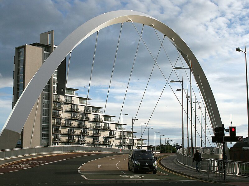 The Clyde Arc is a road bridge spanning the River Clyde in Glasgow, Scotland, connecting Finnieston near the Clyde Auditorium and SEC with Pacific Quay and Glasgow Science Centre in Govan. A prominent feature of the bridge is its innovative curved design and the way that it crosses the river at an angle. The Arc is the first city centre traffic crossing over the river built since the Kingston Bridge was opened to traffic in 1970.