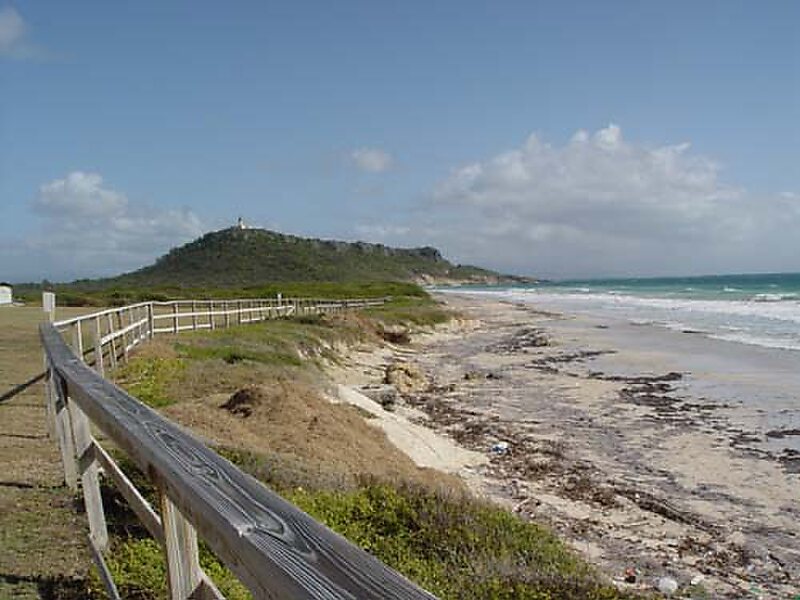 Caja de Muertos is an uninhabited island off the southern coast of Puerto Rico, in the municipality of Ponce. The island and its surrounding waters are protected by the Caja de Muertos Nature Reserve, because of its native turtle traffic and ecological value of its dry forests and reefs. Hikers and beachgoers are often seen in the island, which can be reached by ferry from the La Guancha Boardwalk sector of Ponce Playa. Together with Cardona, Ratones, Morrillito, Isla del Frio, Gatas, and Isla de Jueyes, Caja de Muertos is one of seven islands ascribed to the municipality of Ponce.