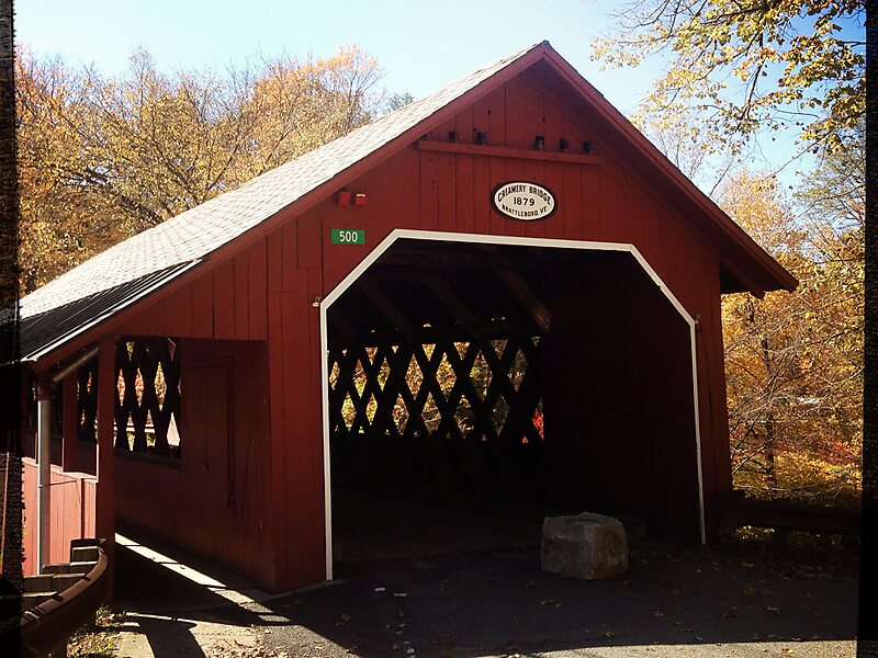 The Creamery Covered Bridge is a historic covered bridge in West Brattleboro, Vermont. Now closed to traffic, the Town lattice truss bridge formerly carried Guilford Road across Whetstone Brook, just south of Vermont Route 9. Built in 1879, it is Brattleboro's last surviving 19th-century covered bridge.