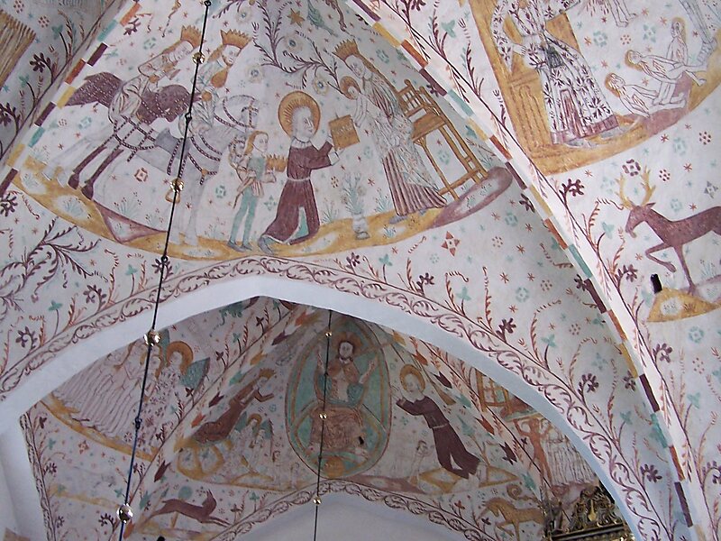 Elmelunde Church, famous for its frescos, is located in the village of Elmelunde, Møn, in southeastern Denmark. It stands high above the surroundings just south of the main road from Stege to the white cliffs of Møn. The impressive whitewashed building can be seen from miles around and has been used as a landmark by sailors in the Baltic Sea.