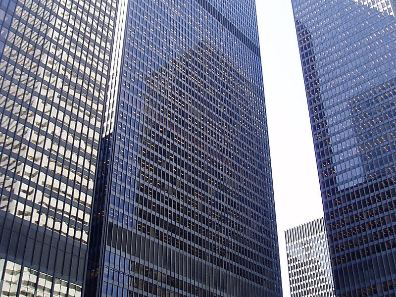 The Financial District is the central business district of Downtown Toronto, Ontario, Canada. It was originally planned as New Town in 1796 as an extension of the Town of York. It is the main financial district in Toronto and is considered the heart of Canada's finance industry. It is bounded roughly by Queen Street West to the north, Yonge Street to the east, Front Street to the south, and University Avenue to the west, though many office towers in the downtown core have been and are being constructed outside this area, which will extend the general boundaries. Examples of this trend are the Telus Harbour, RBC Centre, and CIBC Square.