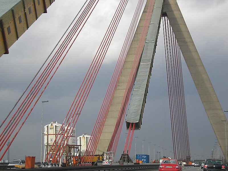 The Flehe Bridge, is a single tower cable stayed bridge located in Düsseldorf, over the Rhine. It connects the A 46 motorway from the left bank of the Rhine with the Bergisches Land on the right bank and the south of Düsseldorf. It forms at the same time the southern part of the ring of motorways around Düsseldorf. It includes a pedestrian and cyclist strip.