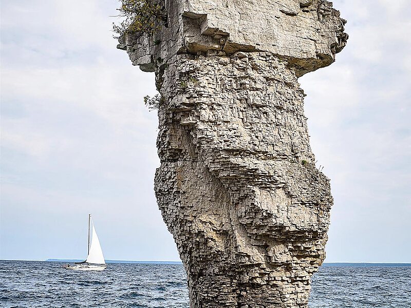 Flowerpot Island is an island in Georgian Bay, in the Canadian province of Ontario, and is a part of Fathom Five National Marine Park. The island spans 2.1 kilometres from east to west, and 1.5 kilometres from north to south, and has a total area of 2 square kilometres. The name of the island comes from two rock pillars on its eastern shore, which look like flower pots. A third flowerpot once stood, but tumbled in 1903.Flowerpot Island is a popular tourist destination, with camping facilities and hiking trails. The island is accessible by cruises and rigid inflatable boats from Tobermory on the Bruce Peninsula.