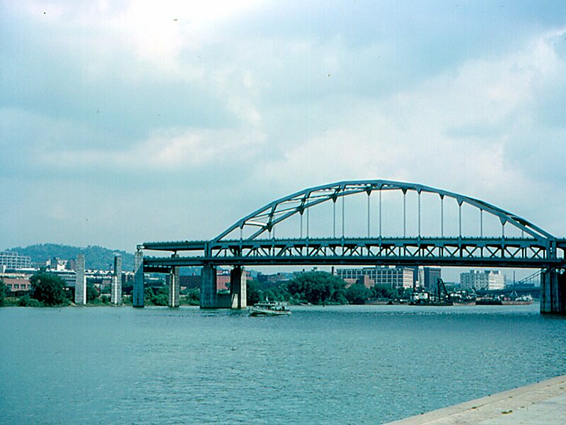 The Fort Duquesne Bridge is a steel bowstring arch bridge that spans the Allegheny River in Pittsburgh, Pennsylvania, United States. It was colloquially referred to as "The Bridge to Nowhere".