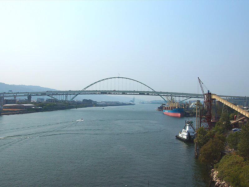 The Fremont Bridge is a steel tied-arch bridge over the Willamette River located in Portland, Oregon, United States. It carries Interstate 405 and US 30 traffic between downtown and North Portland where it intersects with Interstate 5. It has the longest main span of any bridge in Oregon and is the second longest tied-arch bridge in the world. The bridge was designed by Parsons, Brinckerhoff, Quade and Douglas, and built by Murphy Pacific Corporation.The bridge has two decks carrying vehicular traffic, each with four lanes. The upper deck is signed westbound on US 30 and southbound on I-405. The lower deck is signed eastbound on US 30 and northbound on I-405.