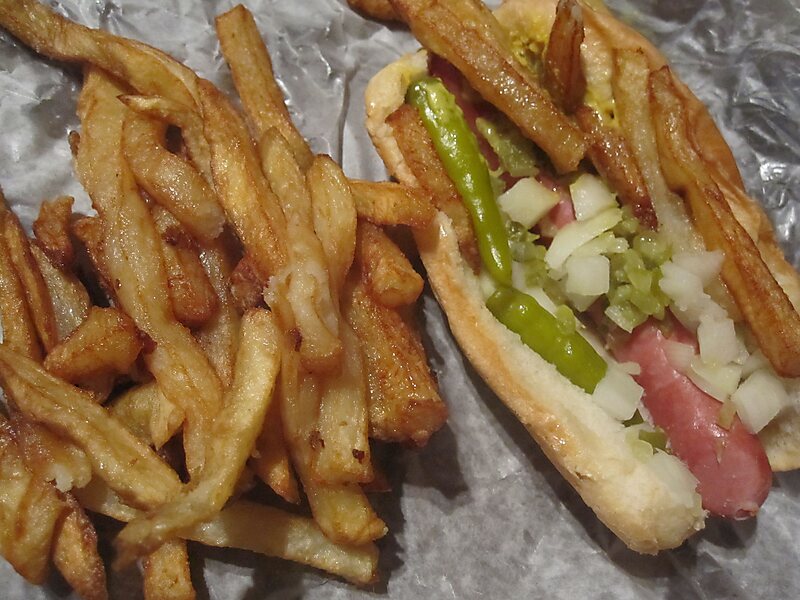 Gene's & Jude's is a popular and iconic hot dog stand in River Grove, Illinois, founded in 1946 by Chicago city worker Gene Mormino. The stand is famous for its limited approach to the Chicago-style hot dog, its toppings departing from tradition by including only mustard, onions, relish, sport peppers and fresh cut French fries placed on top, known as a Depression Dog. The menu is limited to hot dogs, double dogs, tamales and fries, and lacks any trace of ketchup even for dipping the fries.